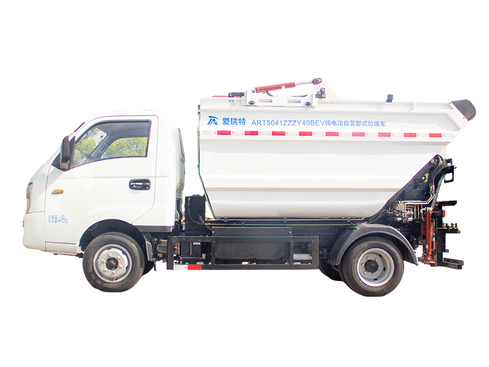 ART5041ZZZY49BEV純電動自裝卸式垃圾車采用后置翻桶機(jī)構(gòu)上料,高位傾翻垃圾箱卸料的生活垃圾收運(yùn)車,能夠同時滿足兩個標(biāo)準(zhǔn)垃圾桶同時上料,?作業(yè)效率極高,?適合城市小區(qū)、主次干道和沿街標(biāo)準(zhǔn)垃圾桶的收運(yùn),同時可以與大型純電動壓縮式垃圾車進(jìn)行車車對接。