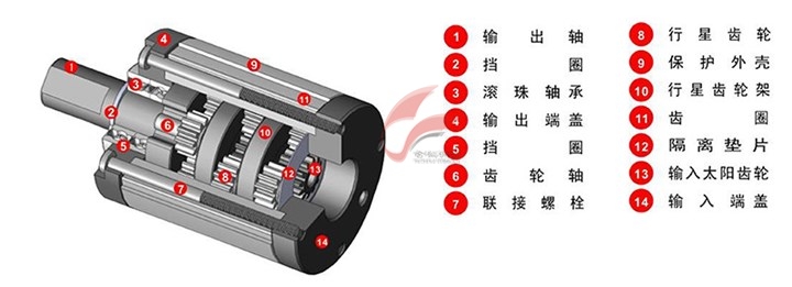 行星減速機(jī)原理:驅(qū)動(dòng)源(馬達(dá))以直接連接的方式啟動(dòng)太陽(yáng)齒輪,太陽(yáng)齒輪將組合于行星齒輪架上的行星齒輪帶動(dòng)運(yùn)轉(zhuǎn)。整組行星齒輪系統(tǒng)沿著外齒輪環(huán)自動(dòng)運(yùn)行轉(zhuǎn)動(dòng),行星架連接出力軸輸出達(dá)到加速目的。更高減速比則需要由多組階段齒輪與行星齒輪倍增累計(jì)而成。