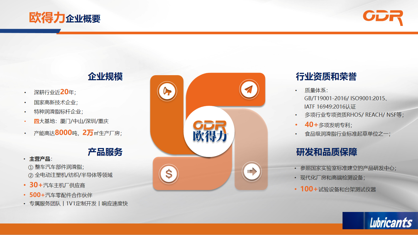 公司專注特種潤滑脂研發(fā)、生產(chǎn)、銷售近30年,擁有10多項(xiàng)發(fā)明專利,為20多家主機(jī)廠配套,合作客戶300+汽車零配件合作伙伴提供專業(yè)的定制化服務(wù);公司擁有100+試驗(yàn)設(shè)備和臺(tái)架測(cè)試儀器,年產(chǎn)能8000噸,擁有2萬平方現(xiàn)代化廠房。質(zhì)量與環(huán)境管理體系完善,研發(fā)團(tuán)隊(duì)強(qiáng)大,與多所高校及科研機(jī)構(gòu)緊密合作,科研實(shí)力雄厚。在中山、深圳、重慶三大研發(fā)基地和中山生產(chǎn)基地及廈門運(yùn)營中心。