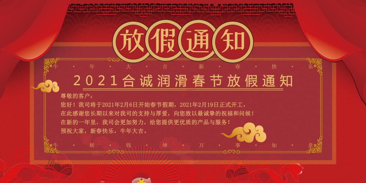 合誠潤滑定于2021年2月6日(農(nóng)歷十二月二十五)至2月18日(農(nóng)歷正月初七)放假共十三天,2月19日(農(nóng)歷正月初八)正式上班。