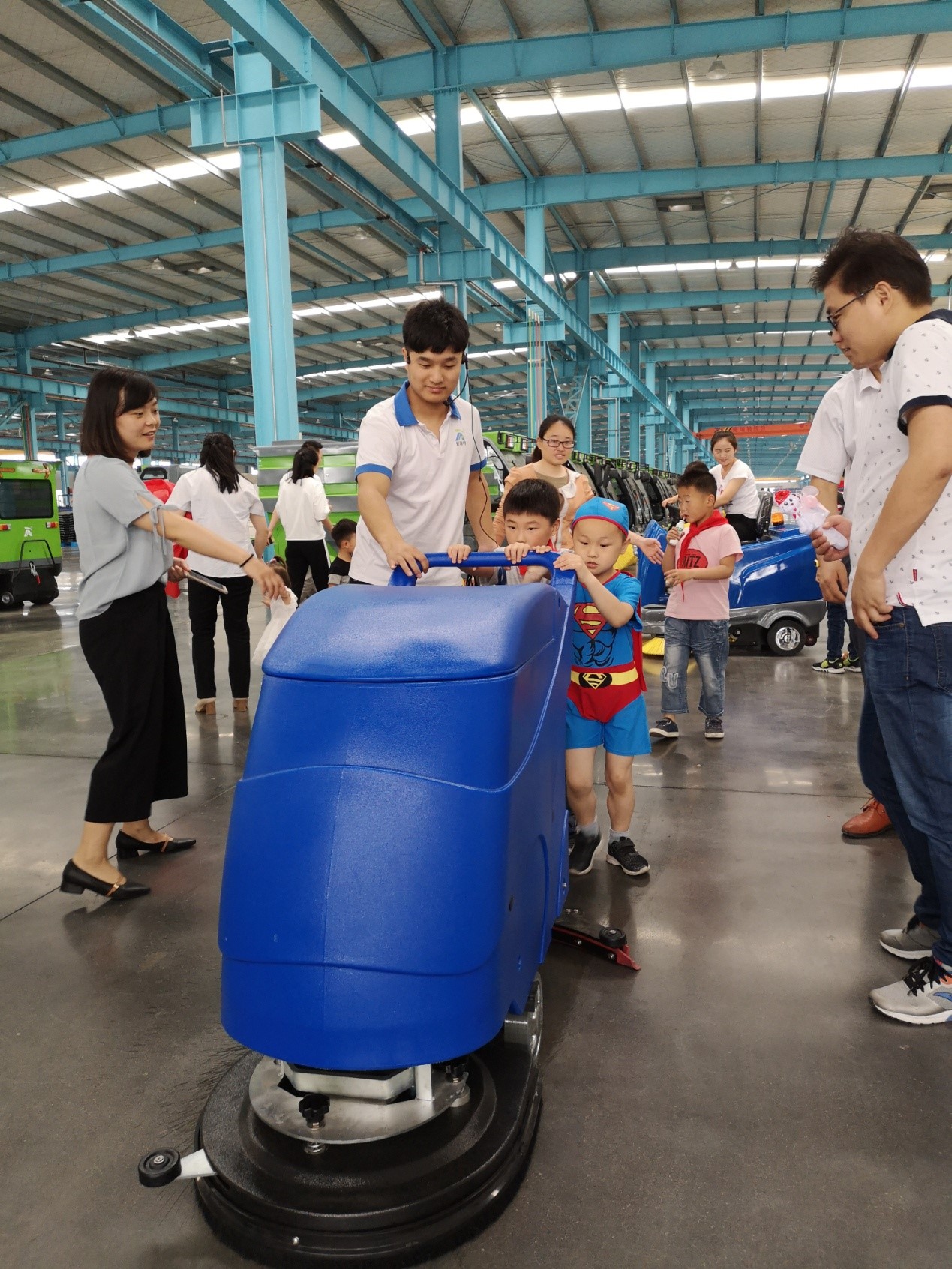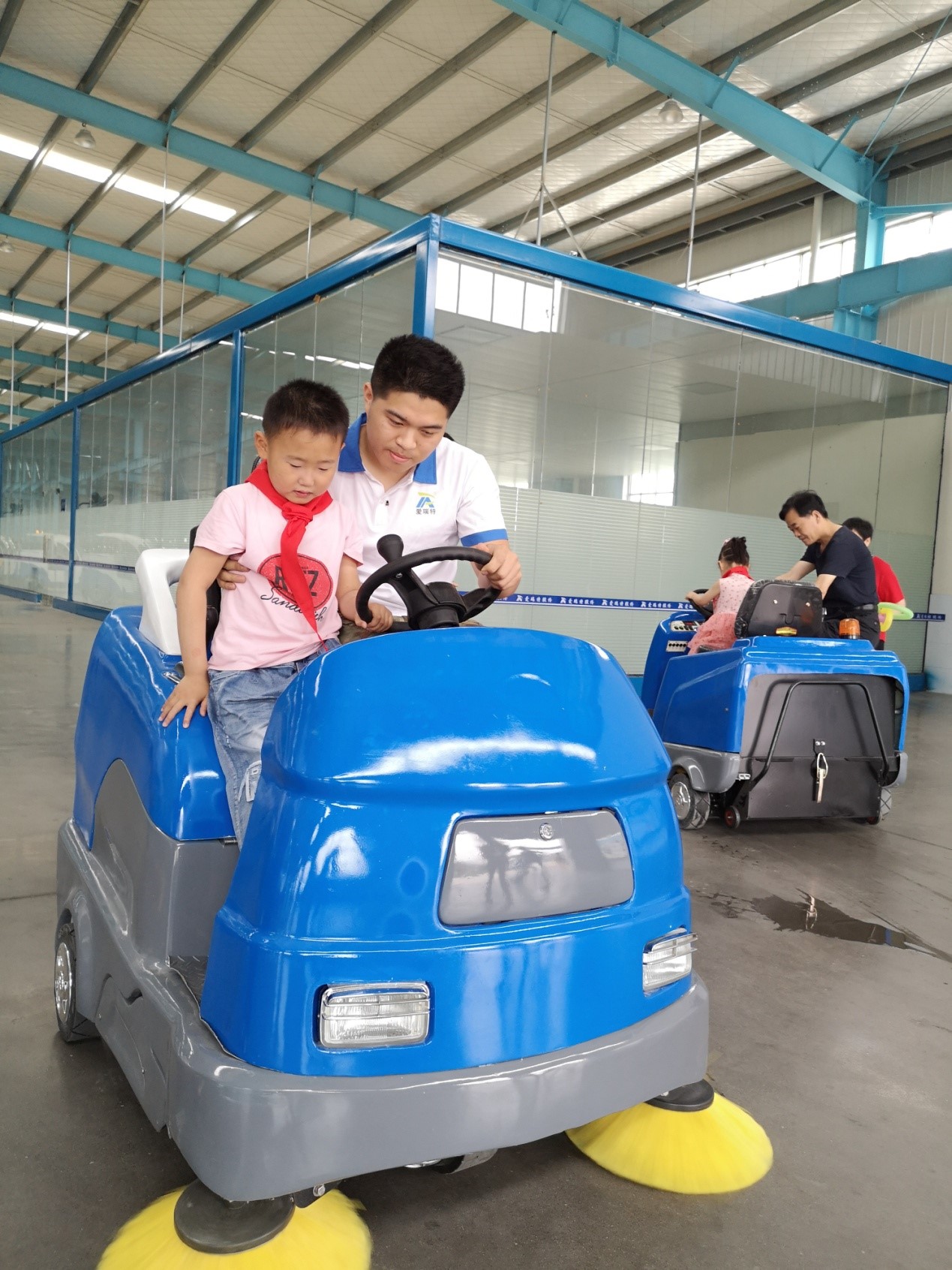 寶貝們開著爸爸媽媽設(shè)計制造的掃地車、洗地機,感到了無比的自豪和興奮,